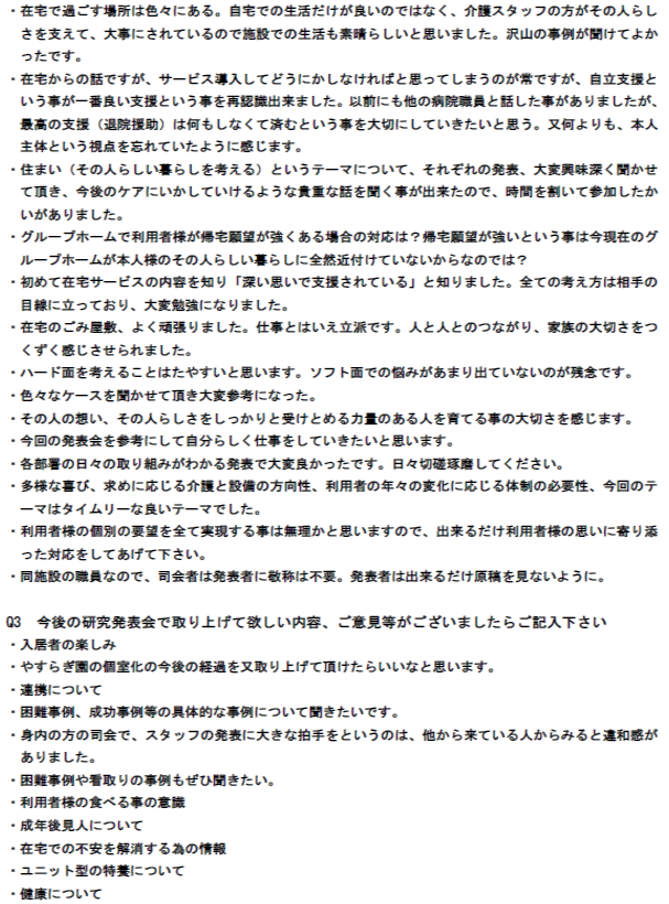 | Q 今後の研究発表会で取り上げて欲しい内容、ご意見等 |